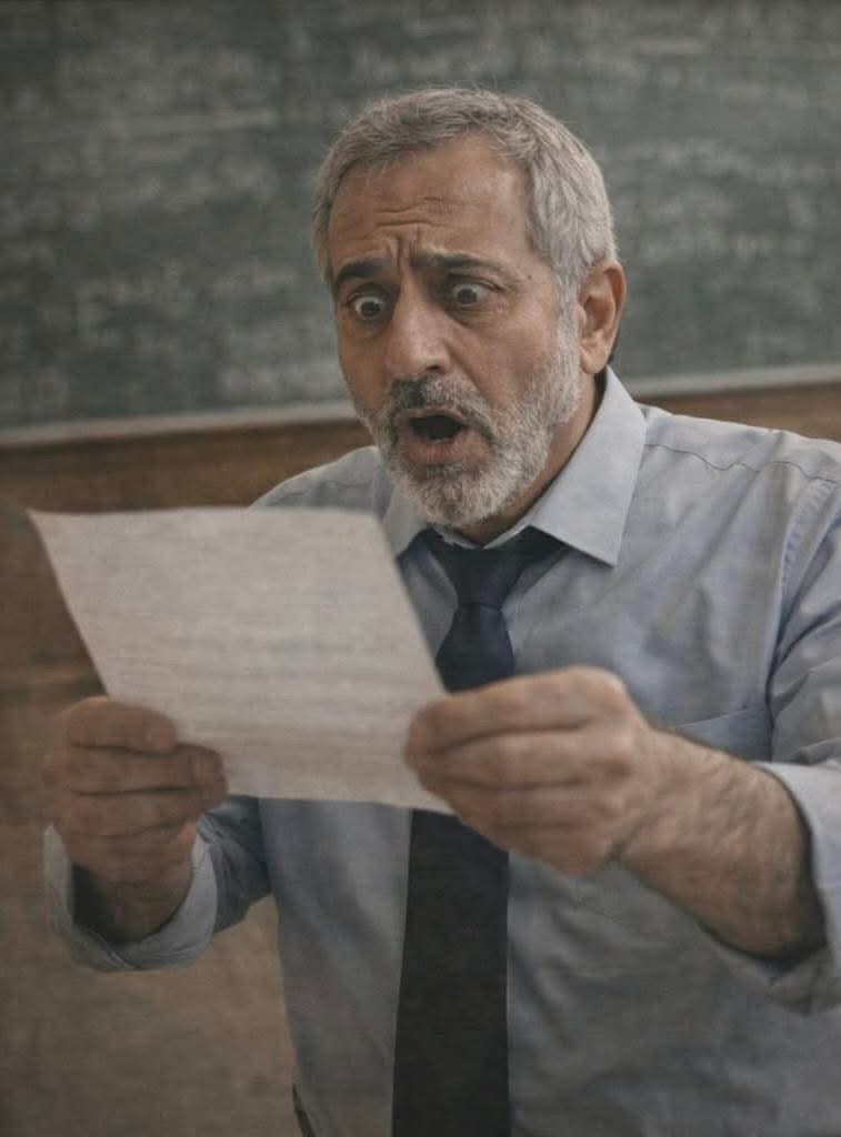 الكل في القاعة كان يحدق فيها بدهشة والصمت كان يضغط على الجميع مثل ثقل غير مرئي. الأستاذ نفسه لم يستطع الكلام وكأن الكلمات عجزت عن وصف ما رأته عيناه على الورقة.